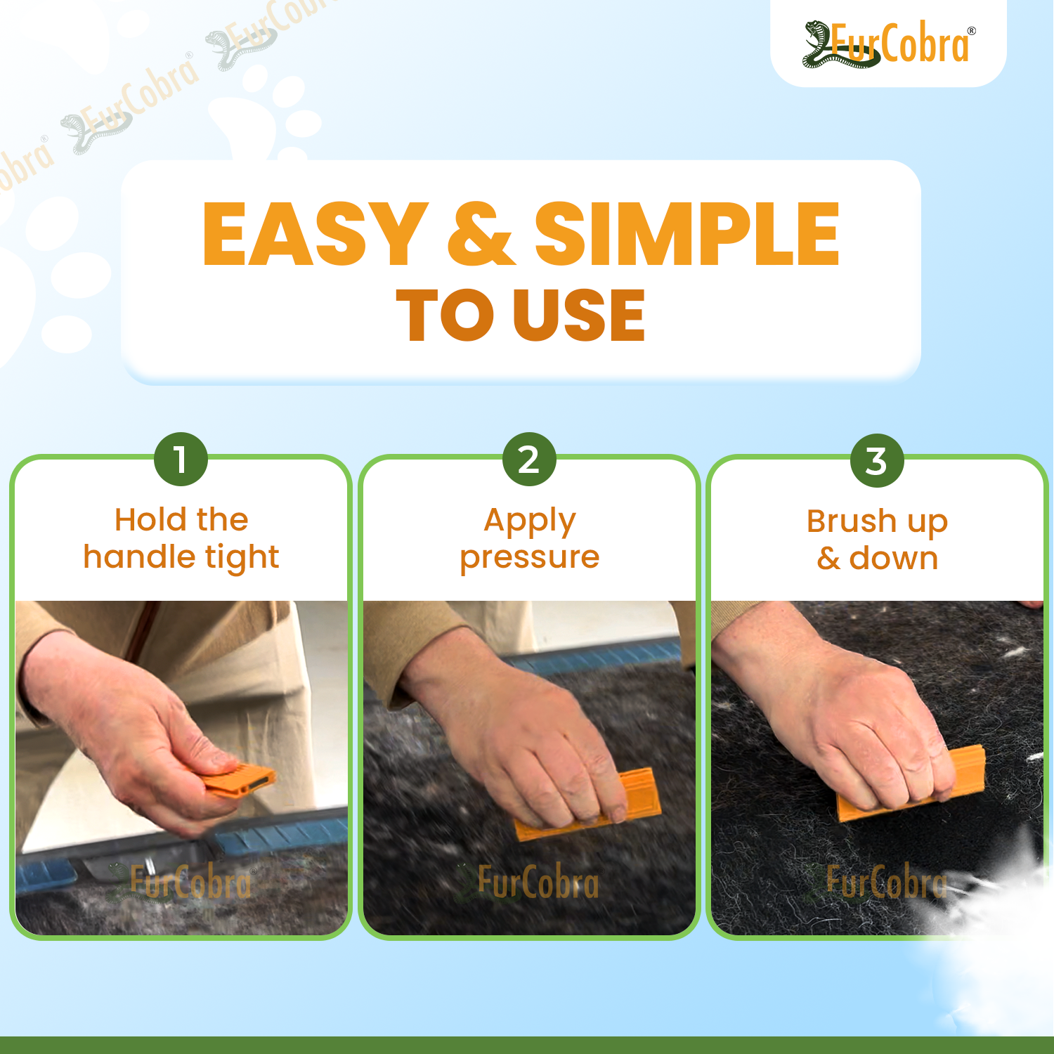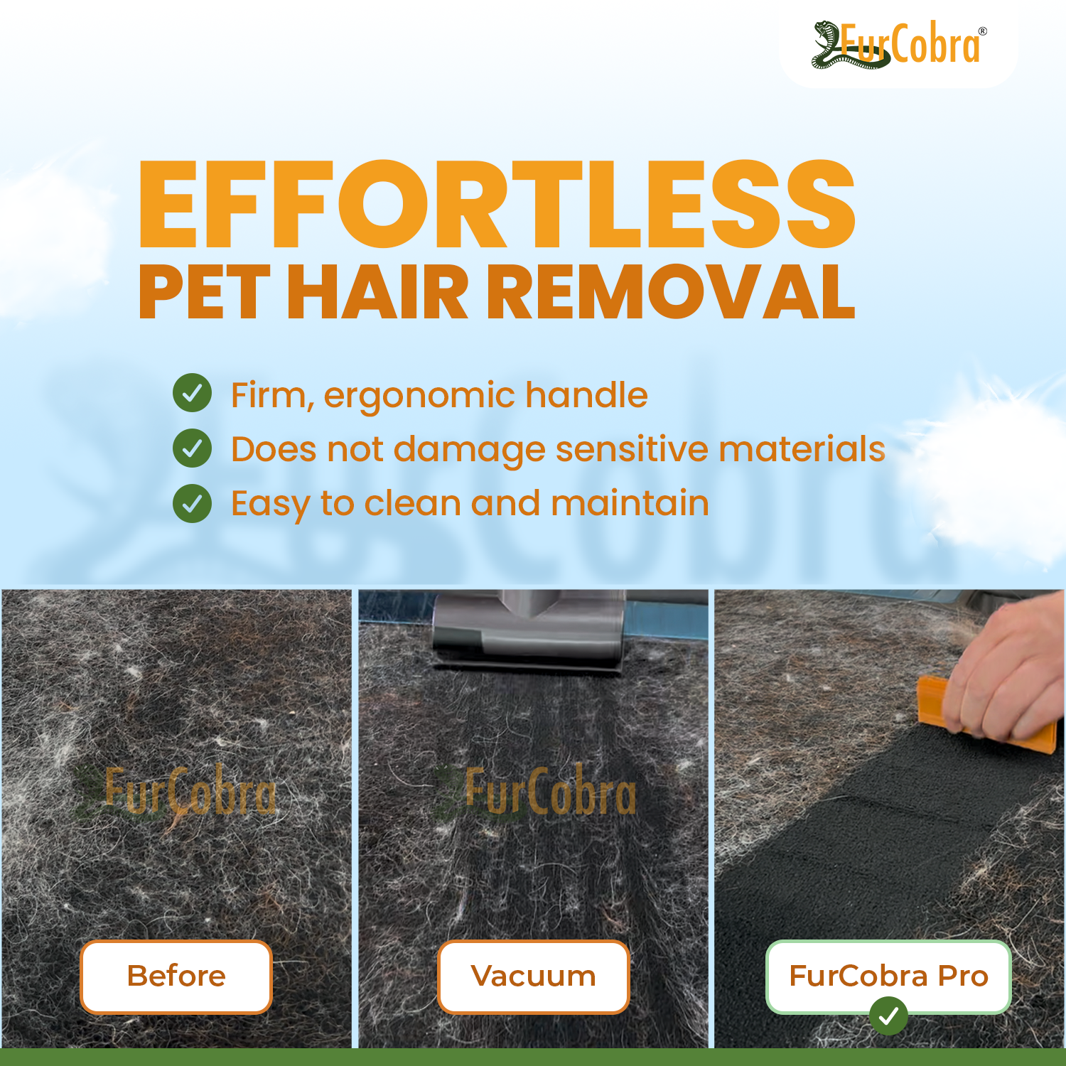 FurCobra Pro on monipuolinen ja käytännöllinen ratkaisu lemmikkien irtokarvojen poistoon. Se tekee lemmikkien karvojen puhdistamisesta eri pinnoilta, kuten auton verhoilusta, huonekaluista ja matoista, vaivatonta ja tehokasta. Pidä ympäristösi siistinä ja karvattomana FurCobra Pron avulla.